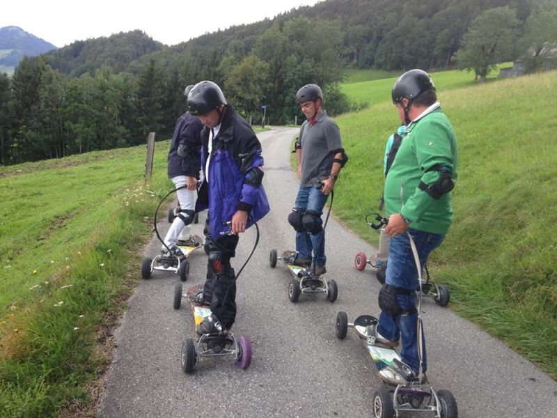 Am 23. August trafen sich ca. 20 Jahrgänger beim Restaurant Schäfli Haslen. Pünktlich zum Treffpunkt war auch der Regenschauer vorbei. Die Sonne zeigte sich zwar nur zögerlich aber die Bedingungen waren ideal, um mit diesen Brettern ins Tal zu sausen.