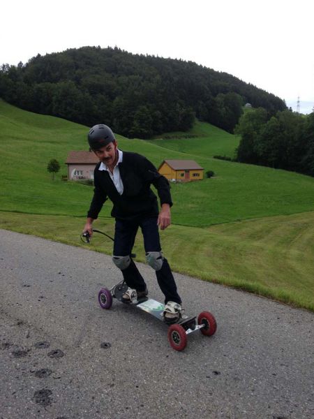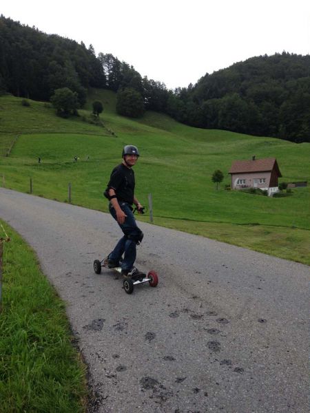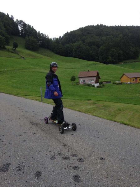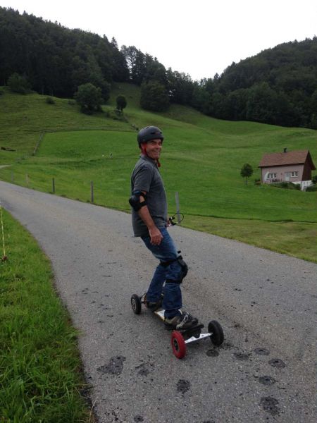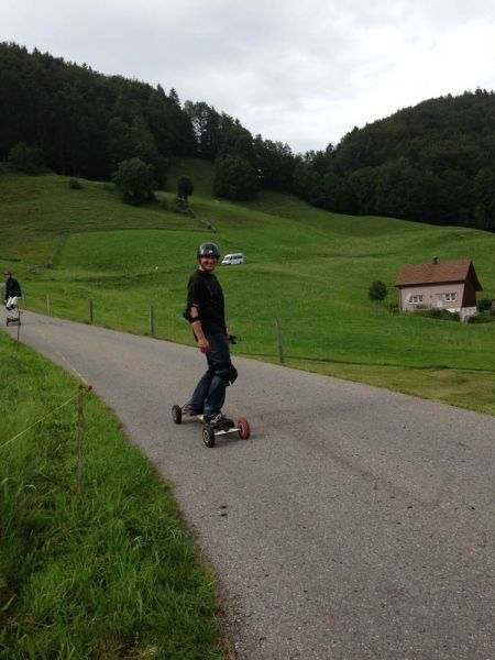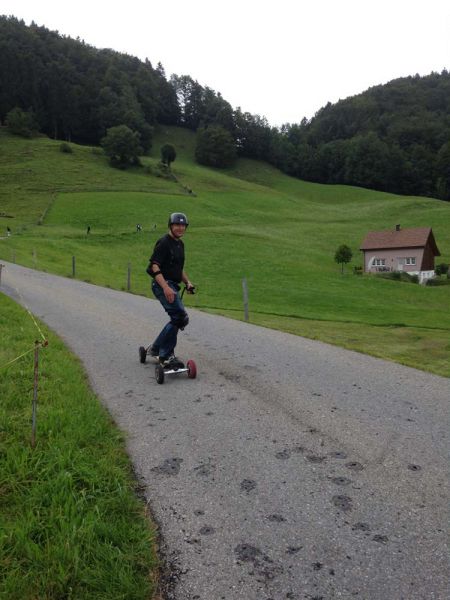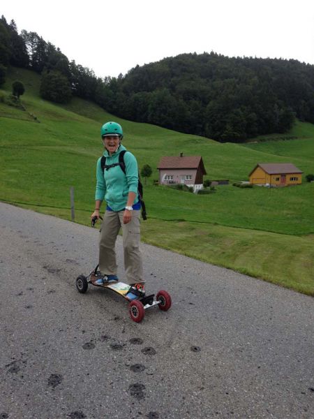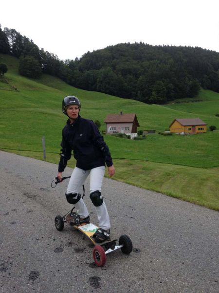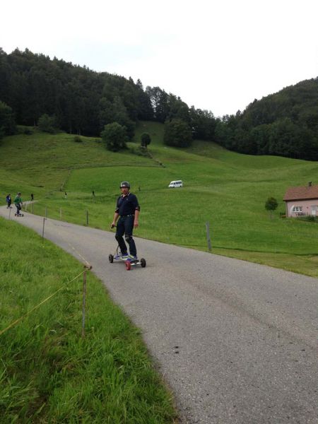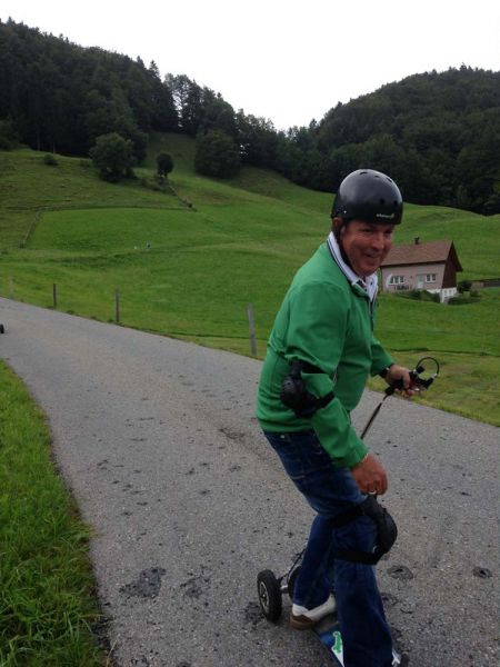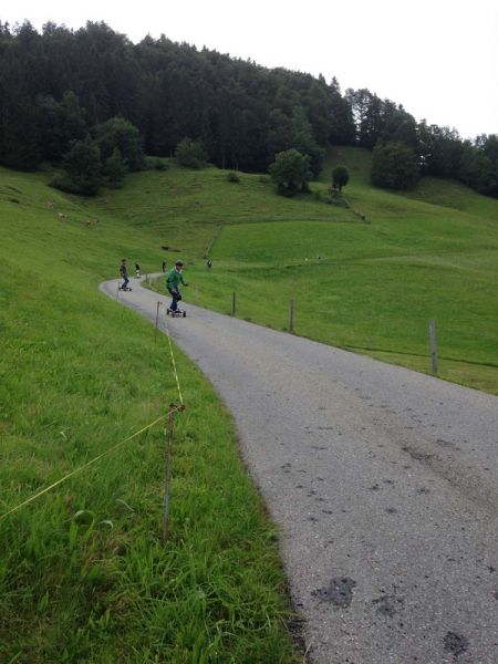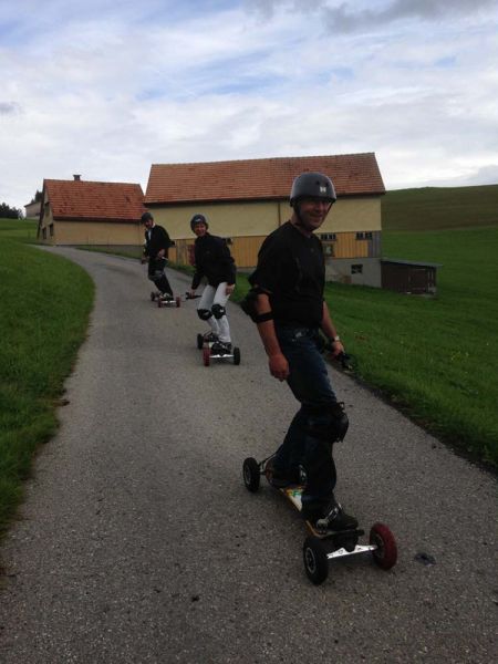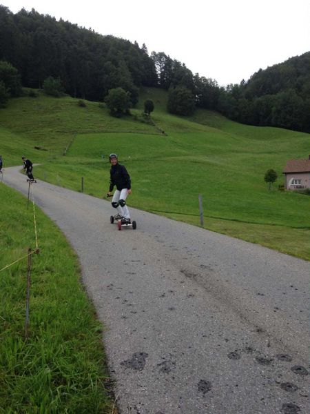 Trotzdem konnte sich nur eine handvoll Wagemutige für das Abenteuer begeistern. Ausgestattet mit Helm, Knie- und Ellbogenschützen wurden die ersten Fahrversuche unter kompetenter Instruktion von Andrea gemacht. Die meisten Jahrgänger schlossen sich jedoch Lüssy zur Wanderung an. Währenddessen gewöhnten sich die Mountainboarder mit jeder Talfahrt besser an ihr Brett und mussten von Andrea vor Übermut bewart werden. Statt bremsen eine elegante Rolle über den Zaun? Zum Glück hat Andrea das nicht gesehen! Unsere Meinung war einhellig; es hat viel Spass gemacht und ist absolut ungefährlich, versucht es mal!