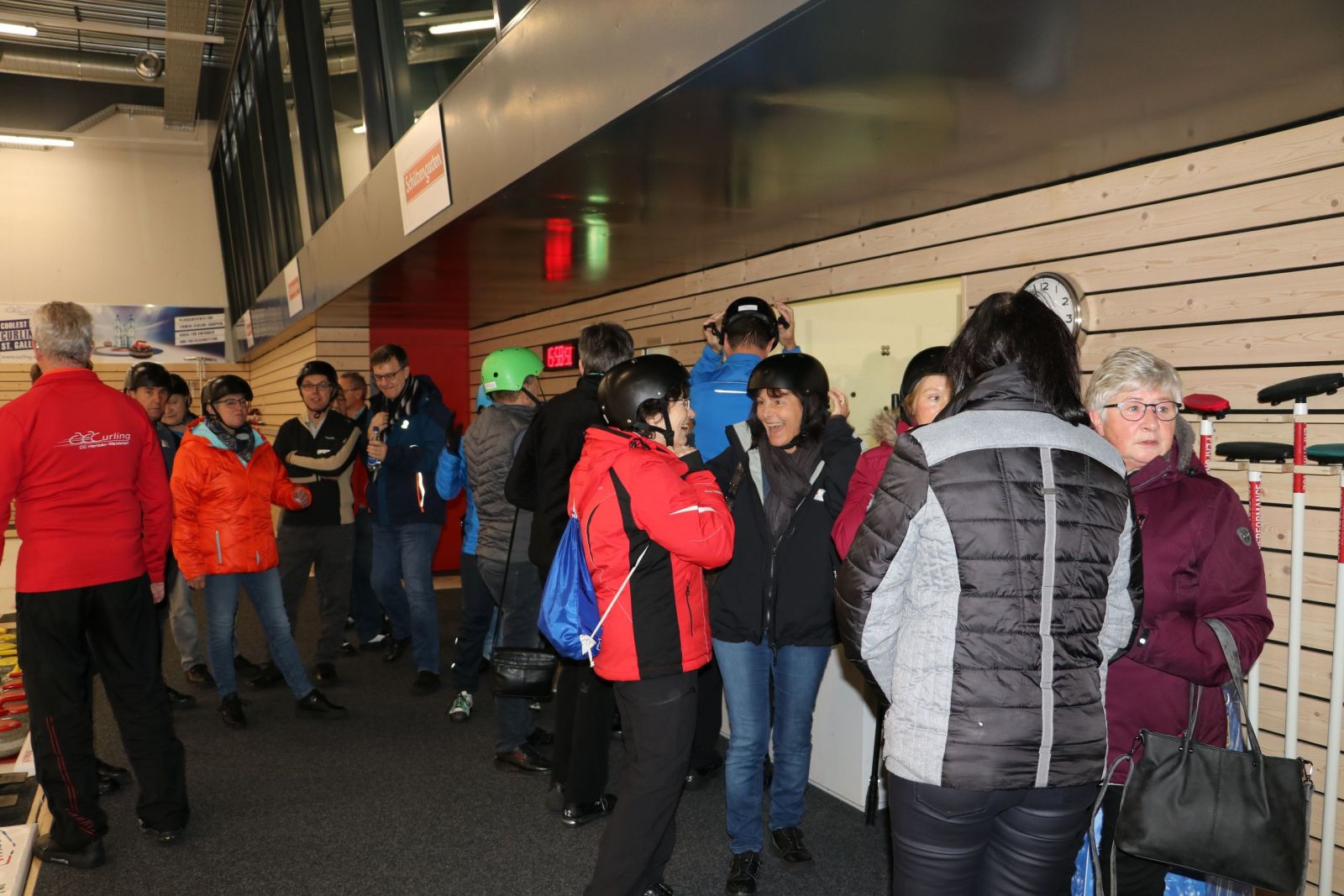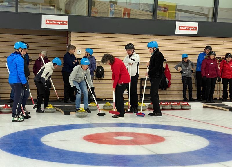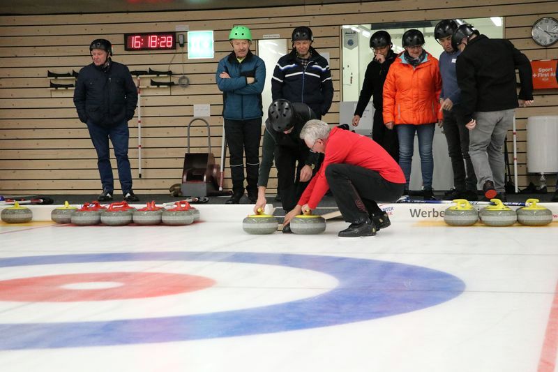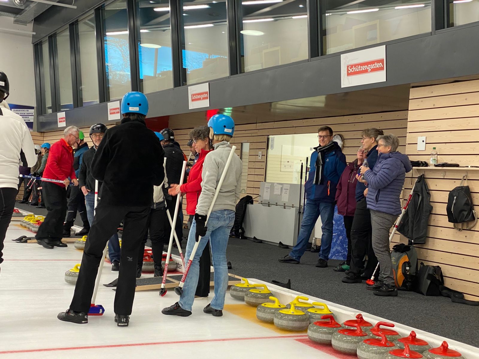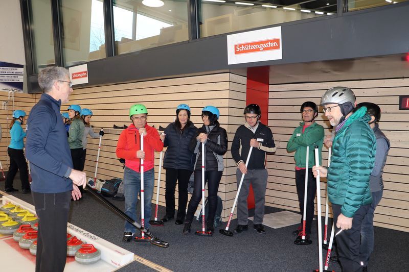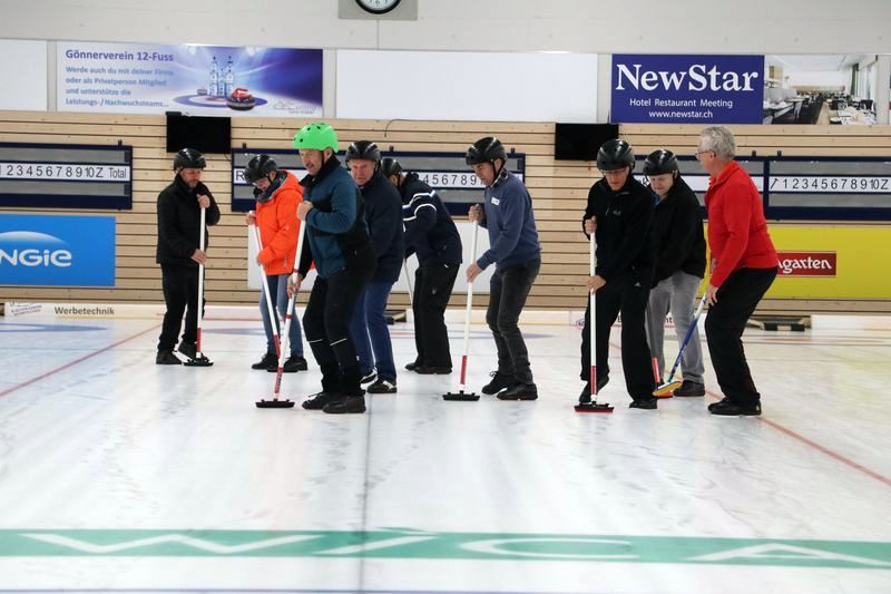 Kurz nach unserer Ankunft wurden wir von vier Instruktoren vom Curling-Club Herisau-Waldstatt in Empfang genommen und mit Curling-Schuhen, Helmen und Besen ausgerüstet. Nach einer Einführung über den Curling-Sport und ein paar Aufwärmübungen waren Körper und Stimmung schon sichtlich lockerer. In vier Teams aufgeteilt wurden alle behutsam aufs Curling eingestimmt, dann ging es auf allen vier Rinks (Bahnen) mit üben los. Wischtechnik und gehen auf dem Eis, Ausgansposition und Sliden wurden fleissig geübt - zuerst mit zwei Steinen, danach mit einem Stein und Besen. Auch die Abgabe des Steines erforderte einiges an Übung. Zugegeben, die Knie und der Allerwerteste wurden nicht bei allen geschont, aber aufgeben kam nicht in Frage. Nach einer Stunde beherrschten schon alle die Grundtechnik und die Teams konnten gegen einander antreten. Mit den Wünschen „guet Stee ond e schös Spiil“ unter den Teammitgliedern war das Spiel lanciert. Mit jedem gespielten End (Runde) wuchs die Spielfreude, der Stolz über einen guten Stein war nicht zu überhören und gepackt vom Siegeswillen waren die Anfangsstrapazen gänzlich vergessen. Am Ende freuten sich alle, die vier Verliererteams über den gewonnen Apéro und die vier Siegerteams über ihren Erfolg.