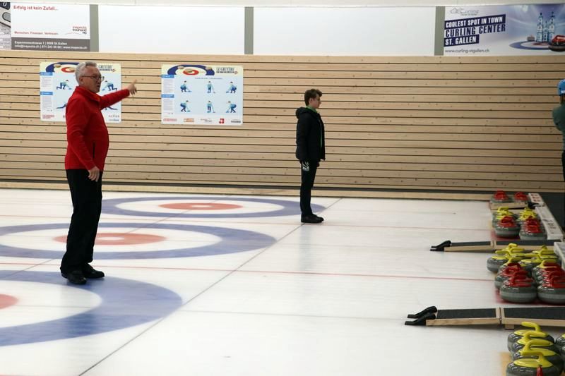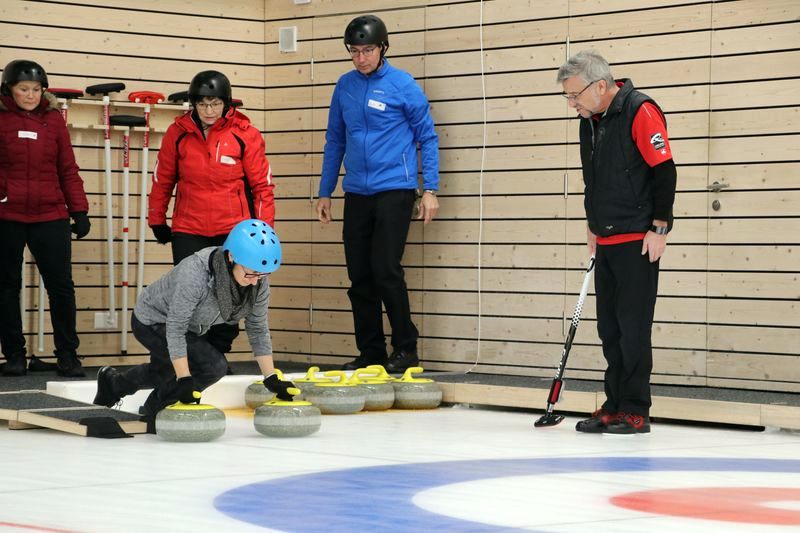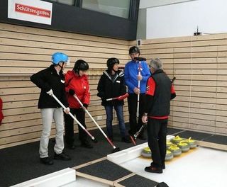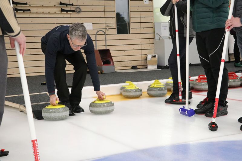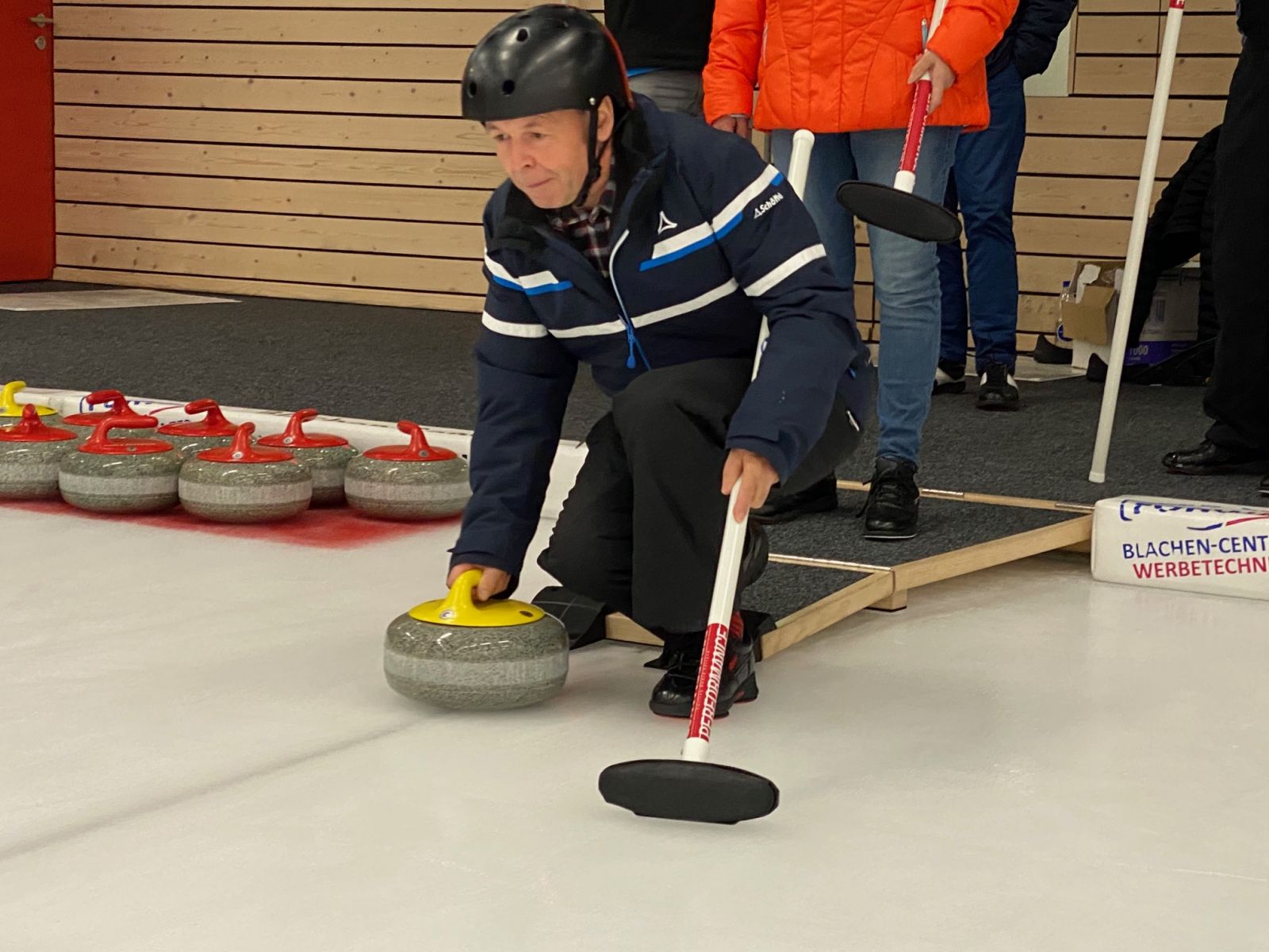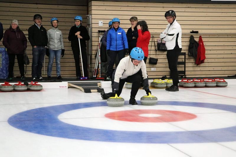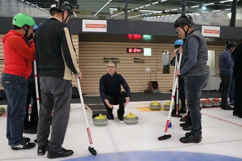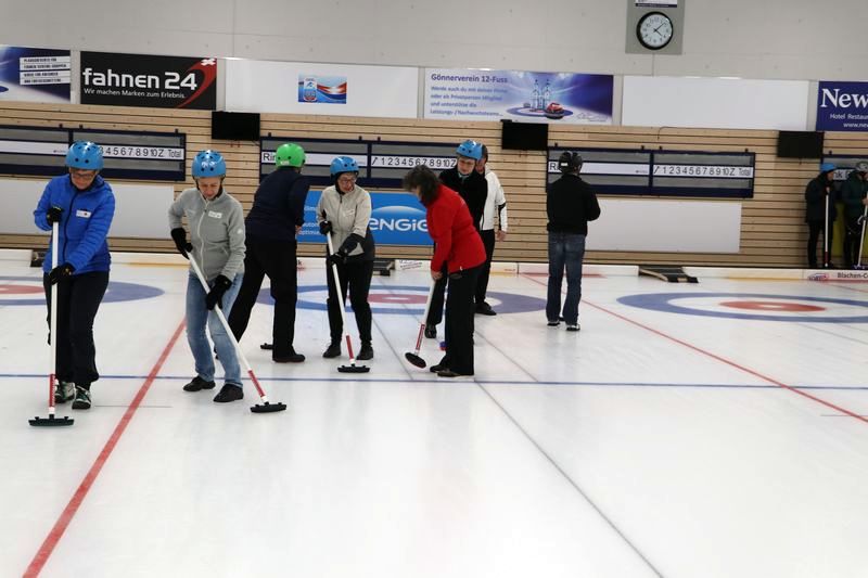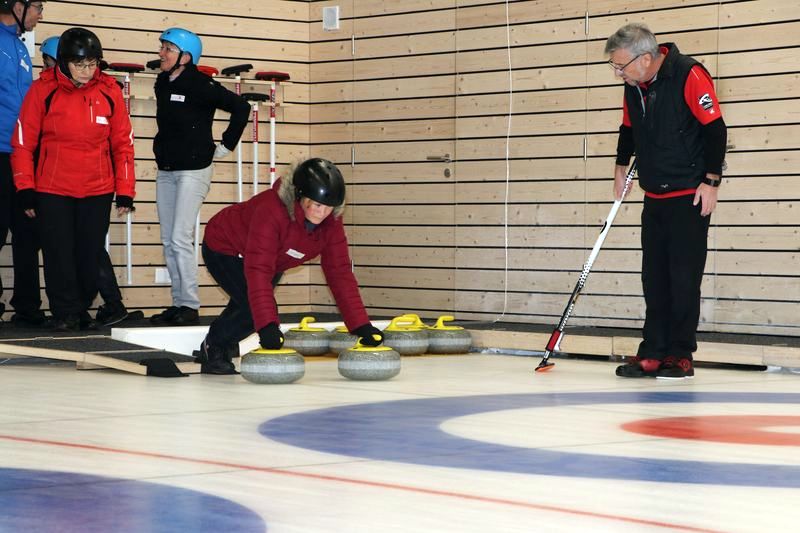 Kurz nach unserer Ankunft wurden wir von vier Instruktoren vom Curling-Club Herisau-Waldstatt in Empfang genommen und mit Curling-Schuhen, Helmen und Besen ausgerüstet. Nach einer Einführung über den Curling-Sport und ein paar Aufwärmübungen waren Körper und Stimmung schon sichtlich lockerer. In vier Teams aufgeteilt wurden alle behutsam aufs Curling eingestimmt, dann ging es auf allen vier Rinks (Bahnen) mit üben los. Wischtechnik und gehen auf dem Eis, Ausgansposition und Sliden wurden fleissig geübt - zuerst mit zwei Steinen, danach mit einem Stein und Besen. Auch die Abgabe des Steines erforderte einiges an Übung. Zugegeben, die Knie und der Allerwerteste wurden nicht bei allen geschont, aber aufgeben kam nicht in Frage. Nach einer Stunde beherrschten schon alle die Grundtechnik und die Teams konnten gegen einander antreten. Mit den Wünschen „guet Stee ond e schös Spiil“ unter den Teammitgliedern war das Spiel lanciert. Mit jedem gespielten End (Runde) wuchs die Spielfreude, der Stolz über einen guten Stein war nicht zu überhören und gepackt vom Siegeswillen waren die Anfangsstrapazen gänzlich vergessen. Am Ende freuten sich alle, die vier Verliererteams über den gewonnen Apéro und die vier Siegerteams über ihren Erfolg.