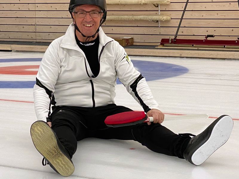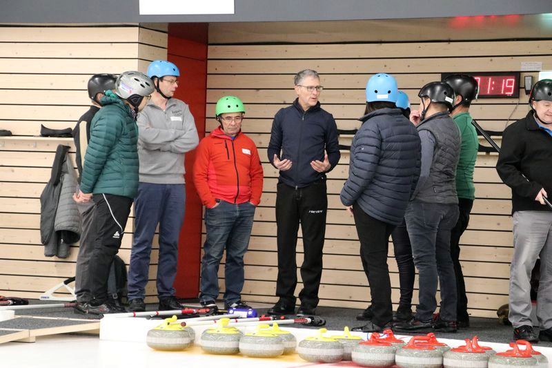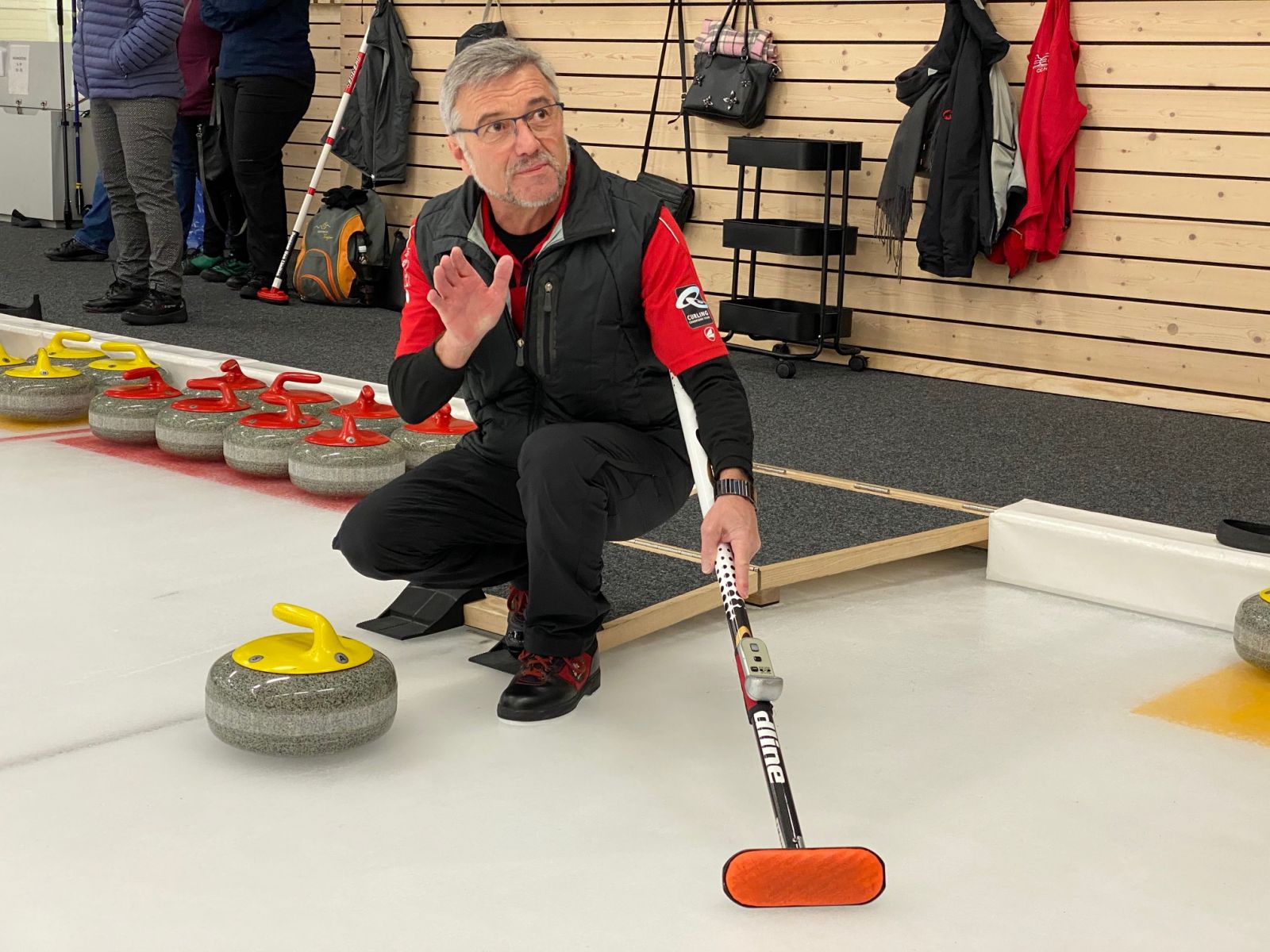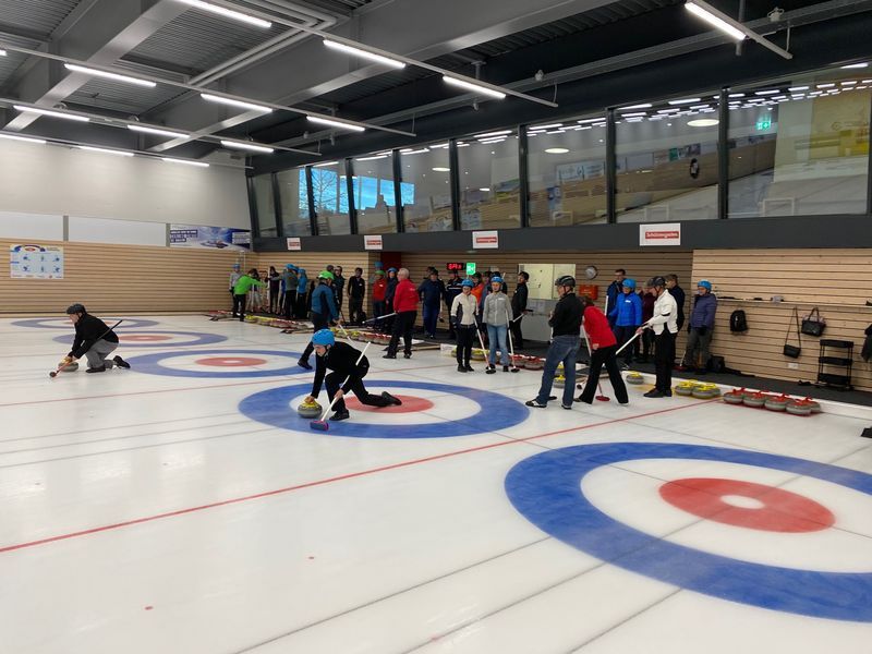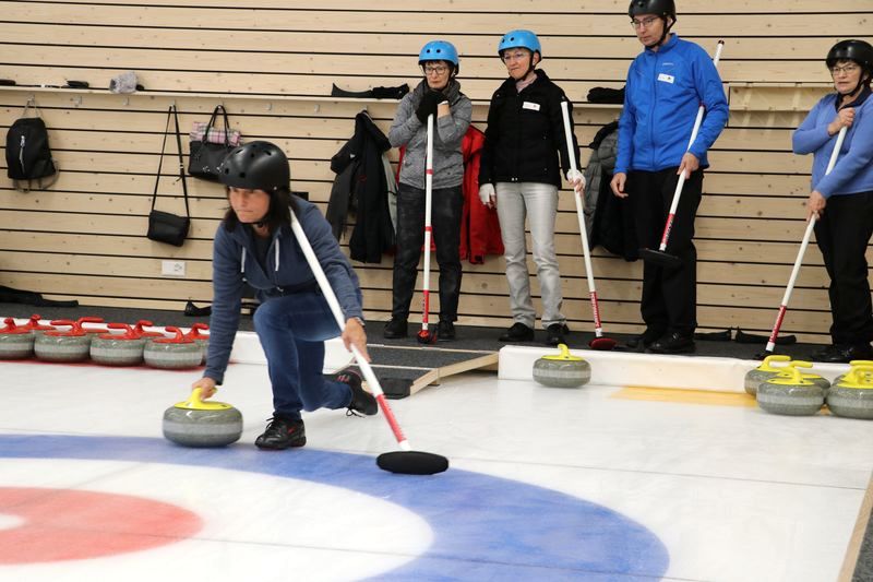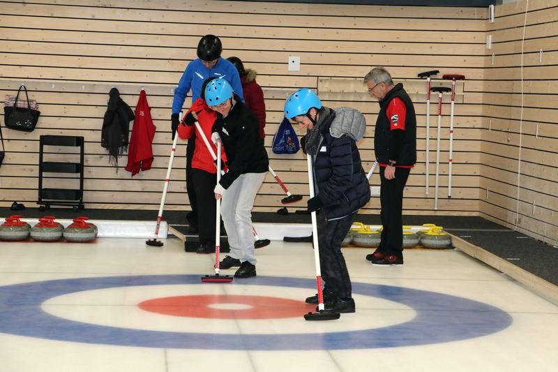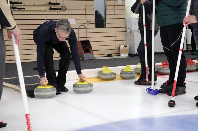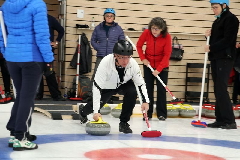 Kurz nach unserer Ankunft wurden wir von vier Instruktoren vom Curling-Club Herisau-Waldstatt in Empfang genommen und mit Curling-Schuhen, Helmen und Besen ausgerüstet. Nach einer Einführung über den Curling-Sport und ein paar Aufwärmübungen waren Körper und Stimmung schon sichtlich lockerer. In vier Teams aufgeteilt wurden alle behutsam aufs Curling eingestimmt, dann ging es auf allen vier Rinks (Bahnen) mit üben los. Wischtechnik und gehen auf dem Eis, Ausgansposition und Sliden wurden fleissig geübt - zuerst mit zwei Steinen, danach mit einem Stein und Besen. Auch die Abgabe des Steines erforderte einiges an Übung. Zugegeben, die Knie und der Allerwerteste wurden nicht bei allen geschont, aber aufgeben kam nicht in Frage. Nach einer Stunde beherrschten schon alle die Grundtechnik und die Teams konnten gegen einander antreten. Mit den Wünschen „guet Stee ond e schös Spiil“ unter den Teammitgliedern war das Spiel lanciert. Mit jedem gespielten End (Runde) wuchs die Spielfreude, der Stolz über einen guten Stein war nicht zu überhören und gepackt vom Siegeswillen waren die Anfangsstrapazen gänzlich vergessen. Am Ende freuten sich alle, die vier Verliererteams über den gewonnen Apéro und die vier Siegerteams über ihren Erfolg.