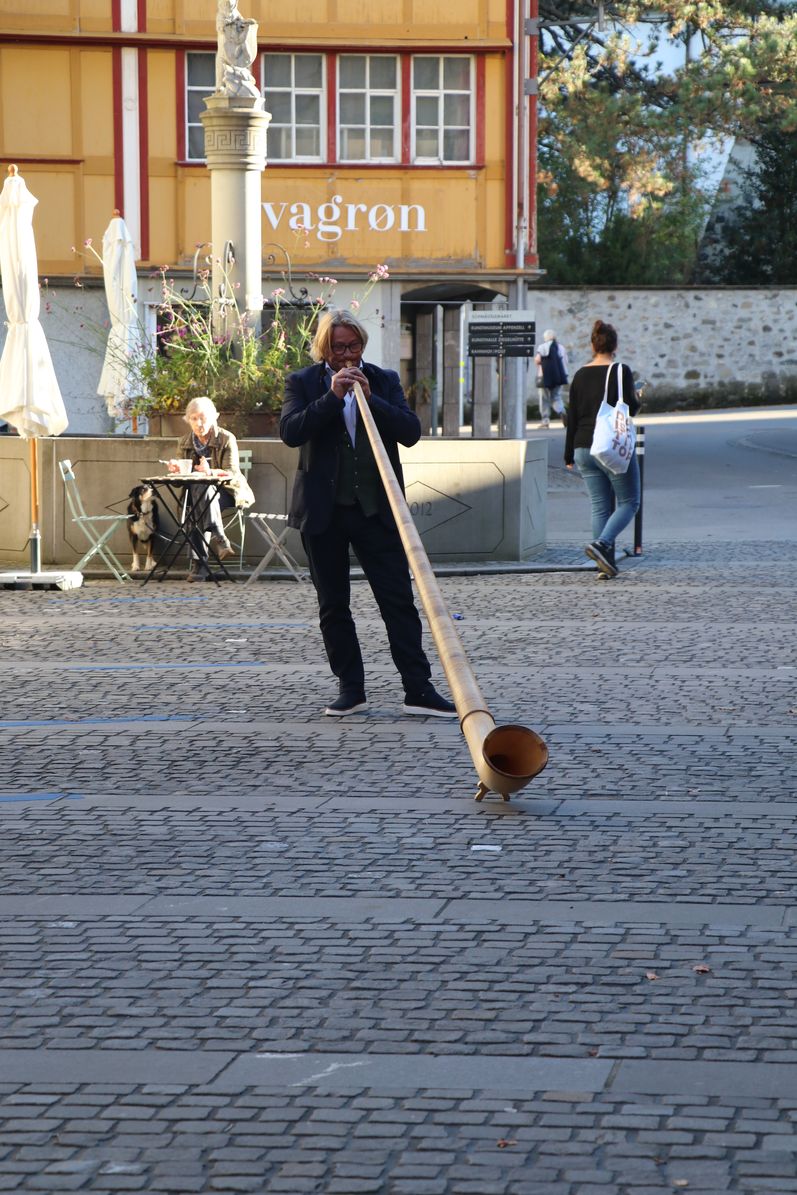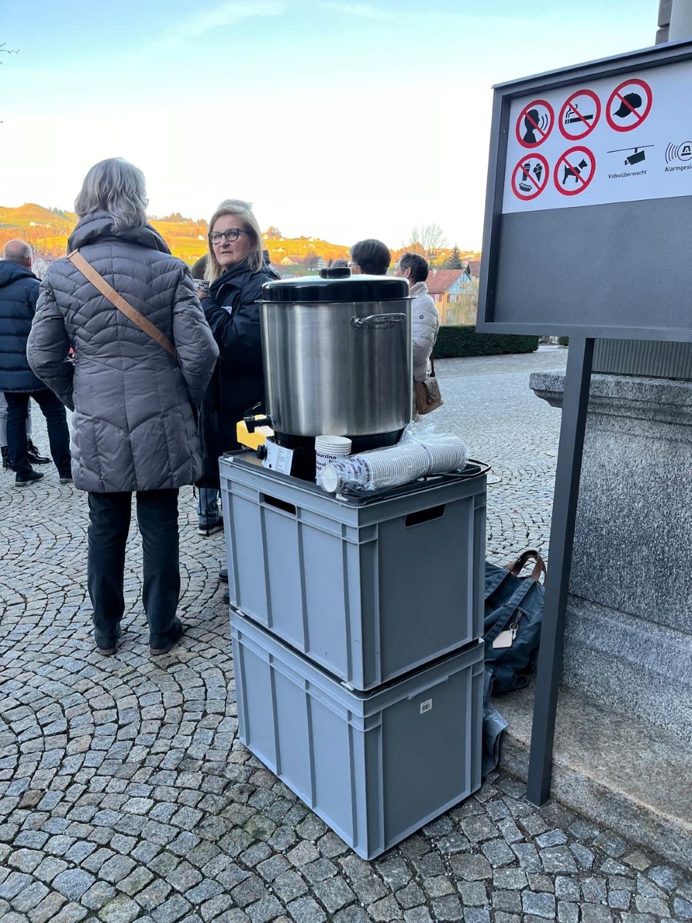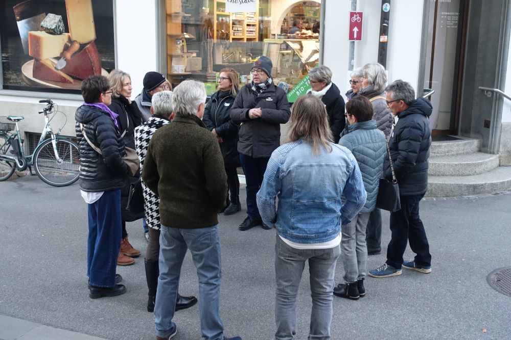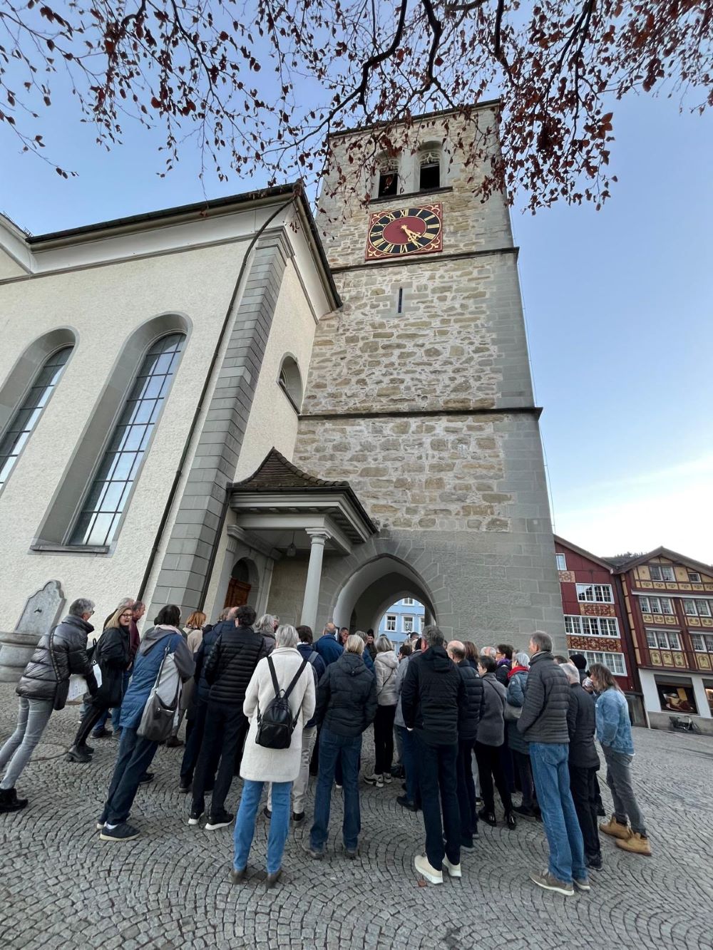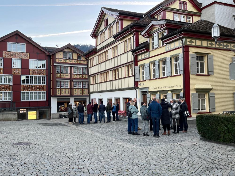 Etwa 60 Jahrgänger/innen treffen uns auf dem Kirchenplatz Moritz und geniessen einen heissen Glühwein. Nach einer kurzen Begrüssung durch die Präsidentin werden wir in 4 Gruppen aufgeteilt und erfahren in der Dorfführung viel Wissenswertes über Appenzell und das legendäre Jahr 1962.